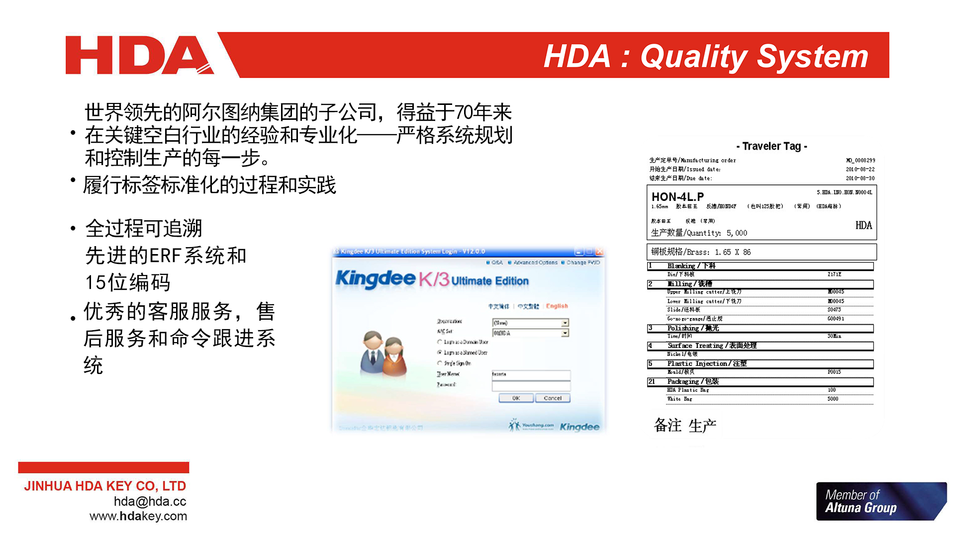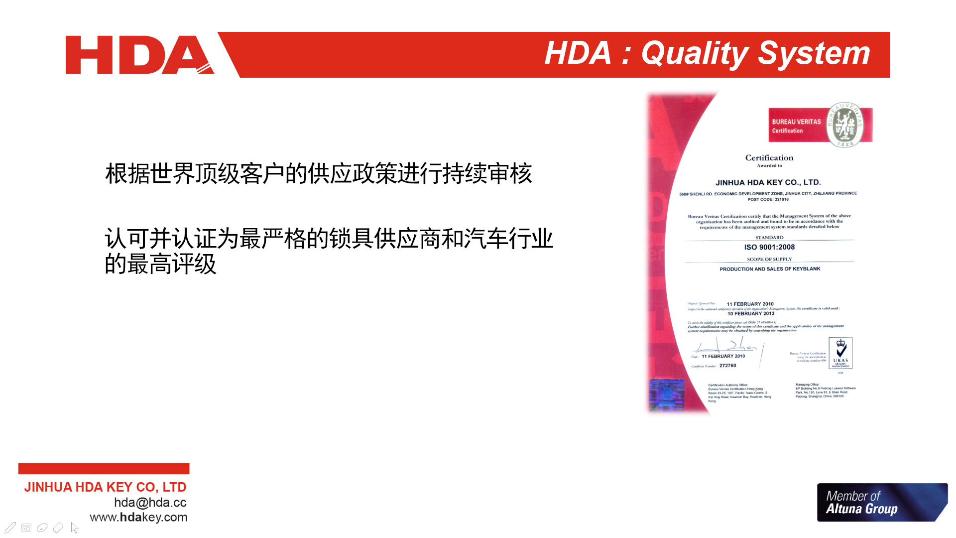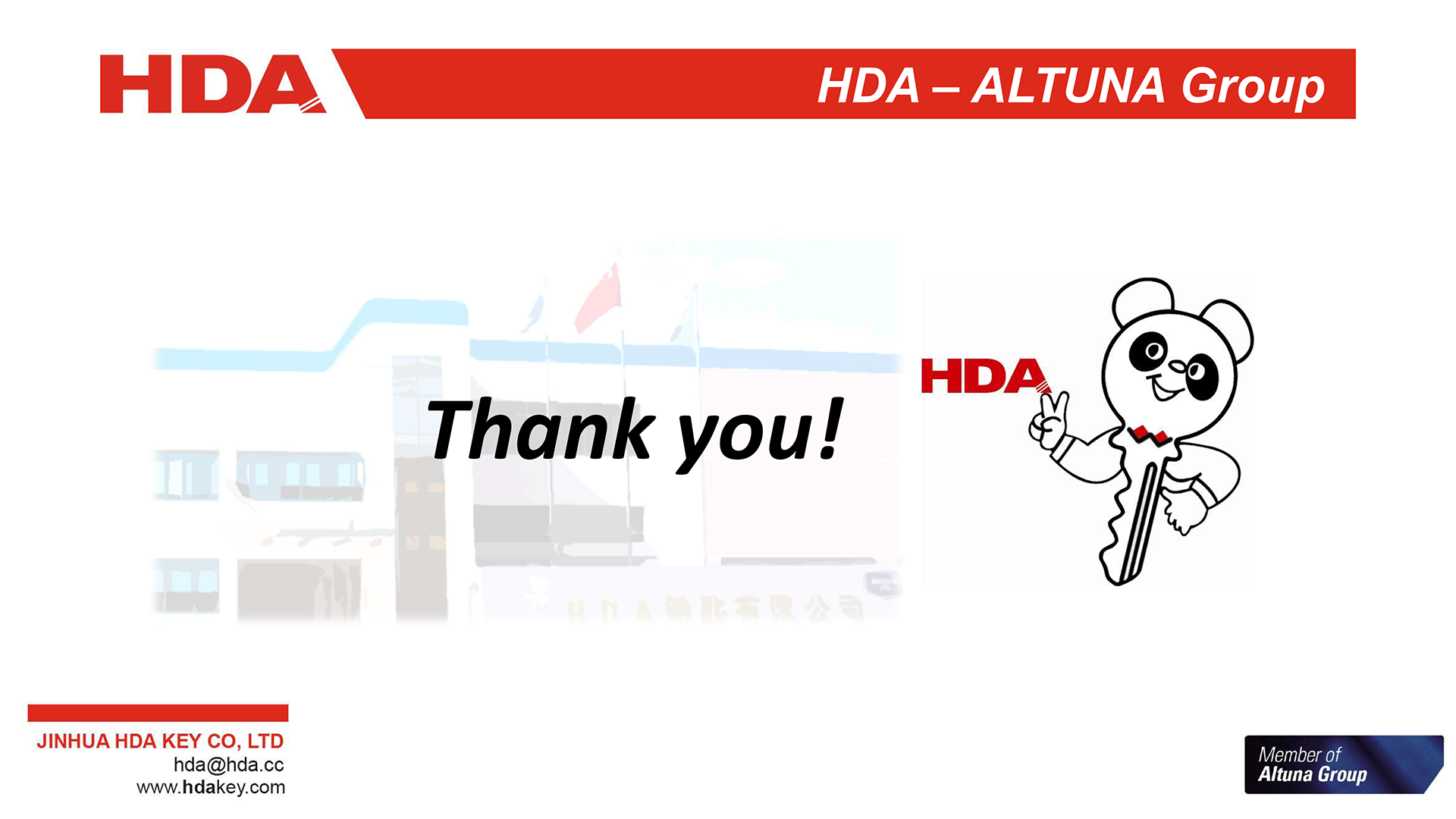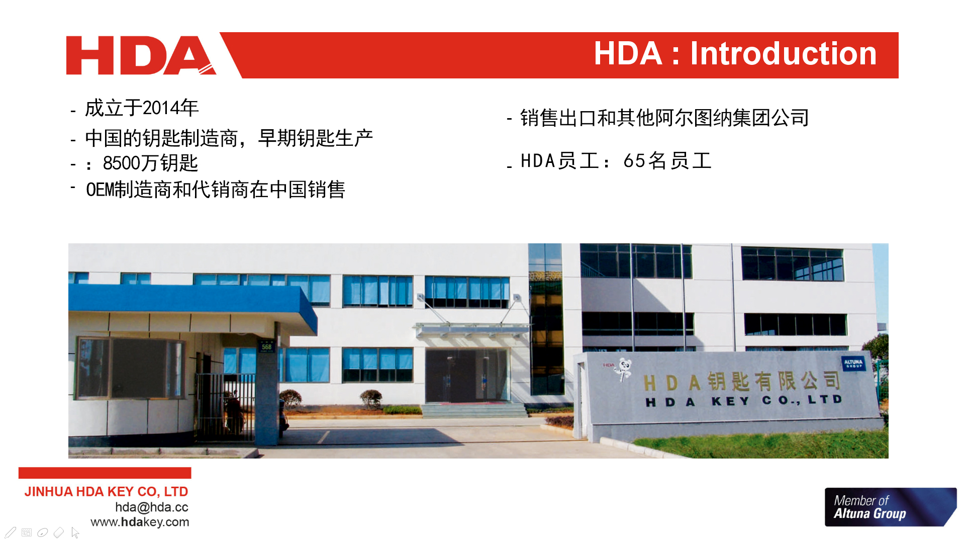 2005年,與歐洲三大鑰匙坯生產(chǎn)企業(yè)之一的西班牙JMA集團成立合資公司--金華HDA鑰匙有限公司。 2007年,轉為西班牙JMA集團獨資子公司。